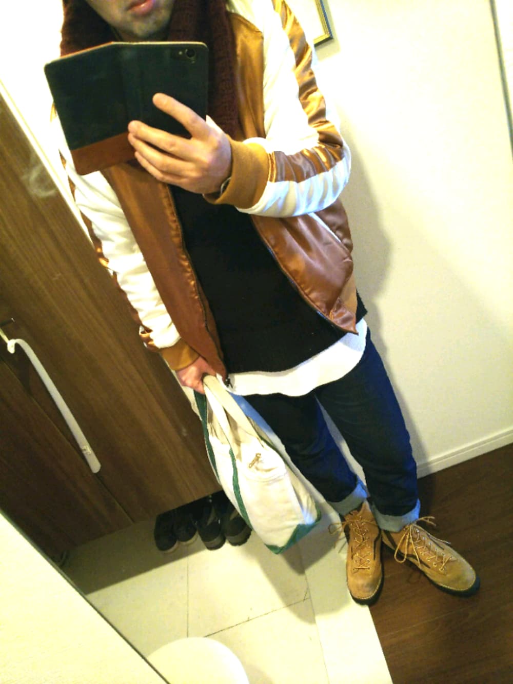 おはようございます。 今日のトップスは、スカジャンにスヌードを巻きました。 インナーはレイヤードスタイル。 ボトムスは、ロールアップさせたスキニー。 足元は、ダナー、マウンテンブーツです。 それでは、良い一日を♪
