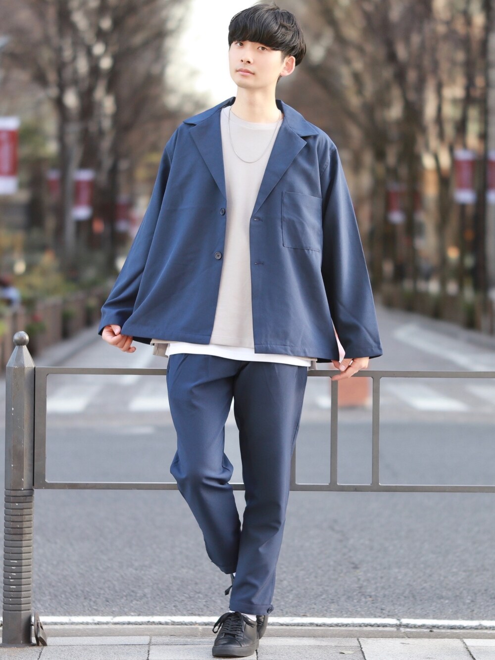 ネイビーのセットアップは薄いグレーのロンTを 合わせると私服感が出て個人的にはオススメ🌟 さりげなくレイヤードさせるのも大切かなと!!