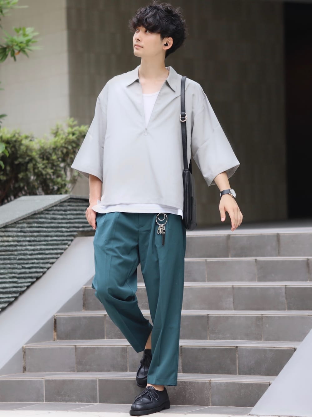 Fujino Masaruのシャツ/ブラウス「【ZIP FIVE】ポリシャンブレー半袖ハーフジップ」を使ったコーディネート
