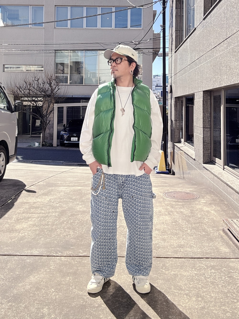 supremeのパンツを軸にコーディネート してみました。ロンTとダウンベスト(緑) それとアクの強いsupremeのパンツ。笑 なるべくグリーン系統多めのコーデスタイル を心掛けてみました。キャップ、ダウンベスト、 スニーカーに、所々グリーンが入ってます。 173cm 78K 26.0cm