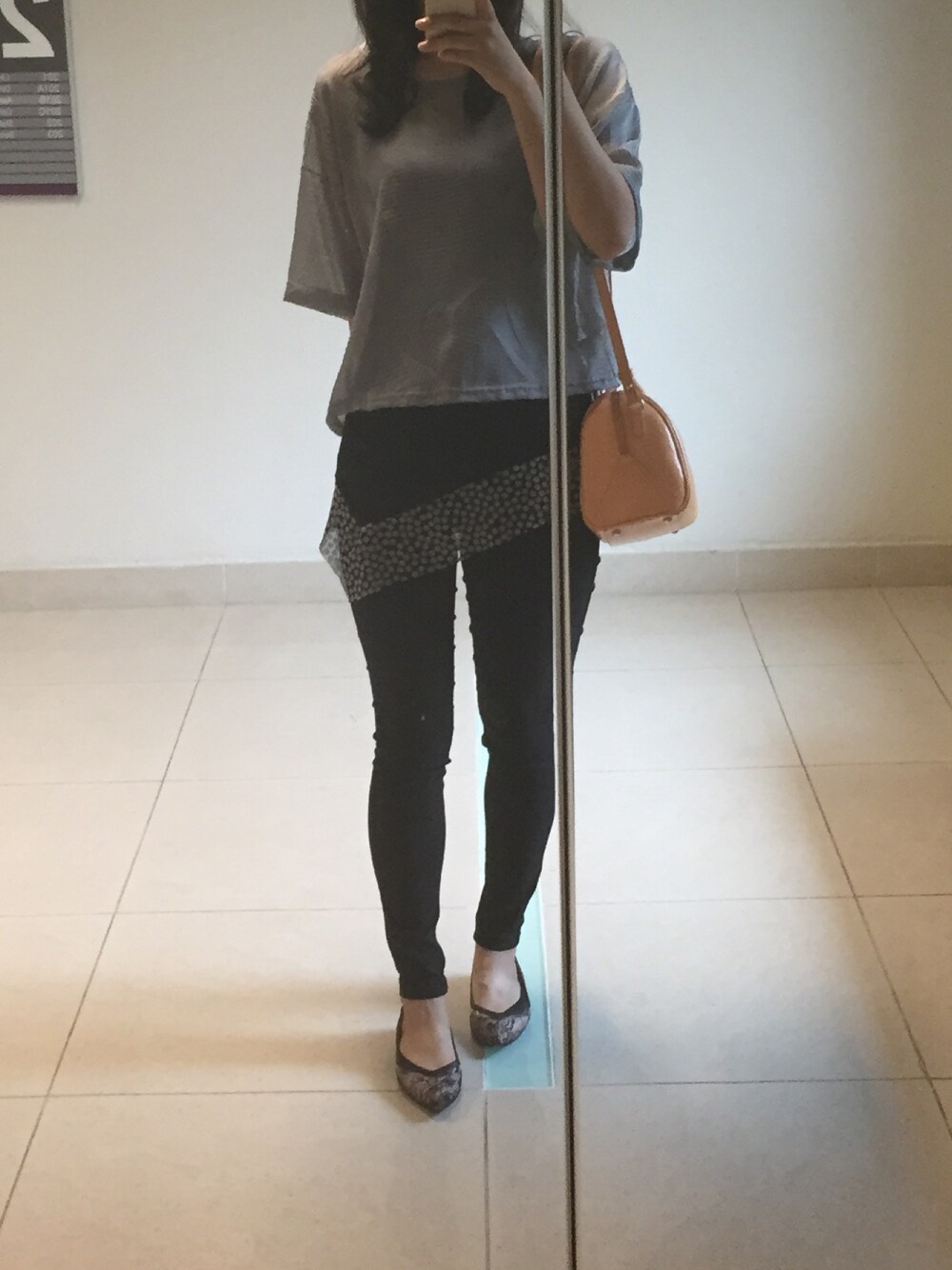 gray top with candy color bag