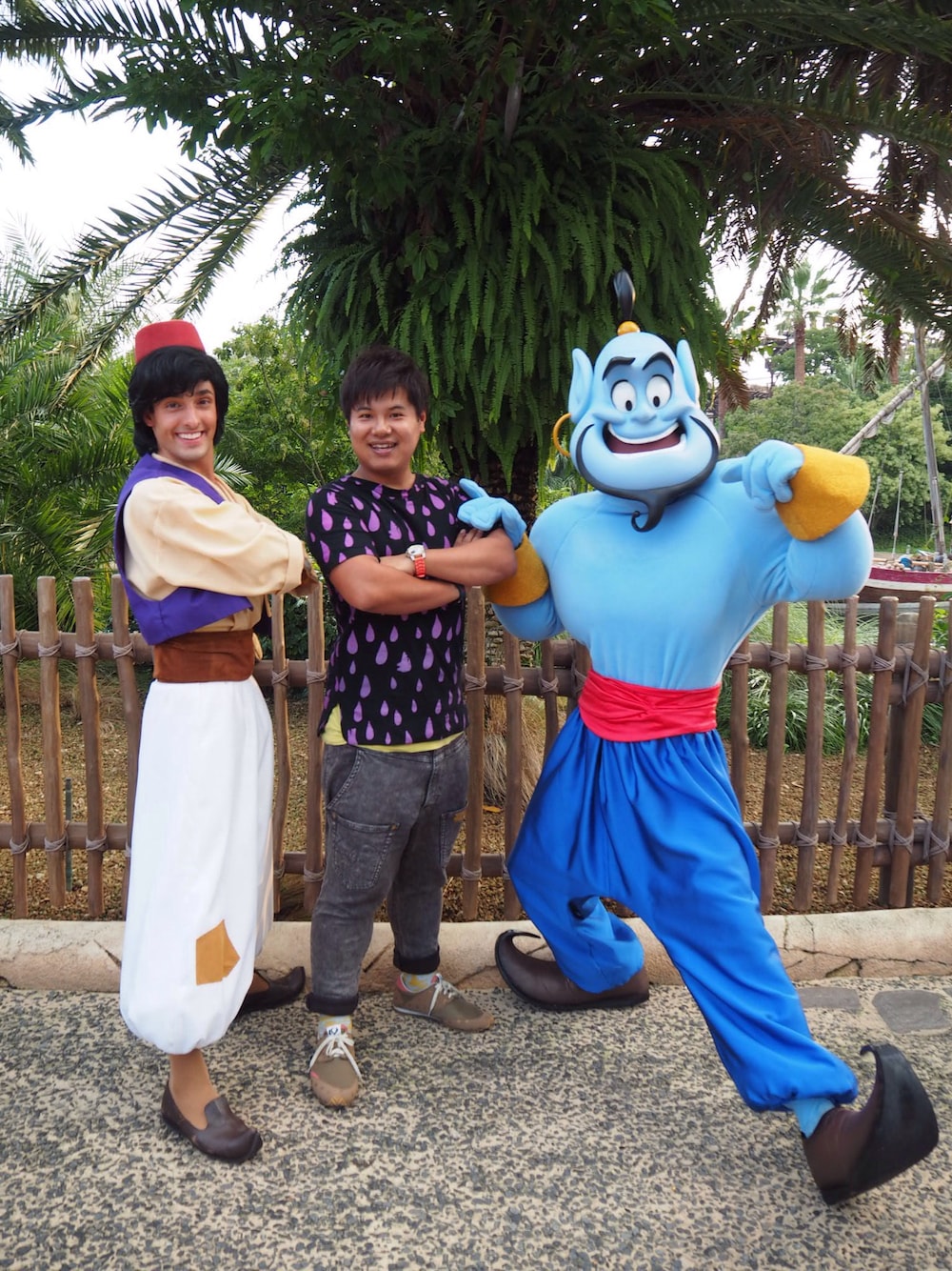 シルバーウィークスタート‼︎制限がかからないことを確認して、お昼からインしてきました。日差しが強くて、人の影に隠れてショーを観て、普段あまり行かないアラビアンコーストまで足を運びました。まさかのアラジン&ジーニーに挟まれて写真を撮ることができてラッキーでした♪
