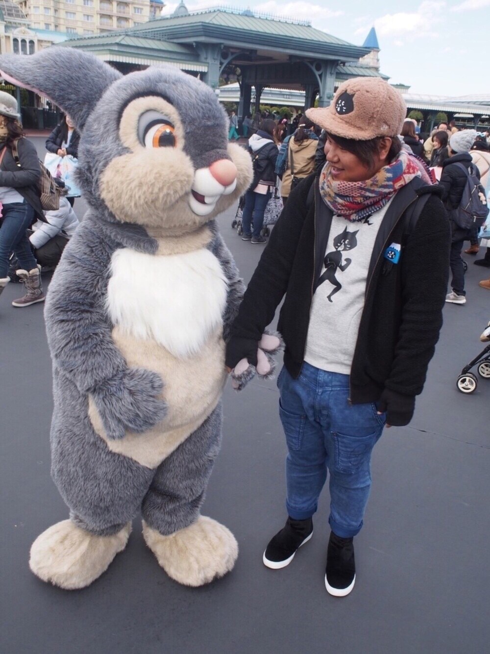 いつもありがとうございます😊 吐きそうな程緊張感溢れる木曜日…本日ウサギになってきました…緊張感から解放されてホッとしています…。 そんなウサギになった日記念で土曜日に会えたとんすけとの一枚を☝️ この日はモフモフな熊さんアウターを着て行ったので靴も合わせて、リュックも熊さん…熊さんコーデにしてみました。 キャラ待ちしてたら寒すぎてフードかぶってマフラー体に巻いて…もう熊の冬眠と相成りましたね。 野生の熊になりかけたのでその後、ドナルドいるかと移動したら会えてポカポカな気持ちになれました✨ 今回にゃーまんのパーカーを着たんだけど地味だけどインパクトあってお気に入りです。かなり買うか悩んだけど…まぁ買って正解だったということにしとく(笑)