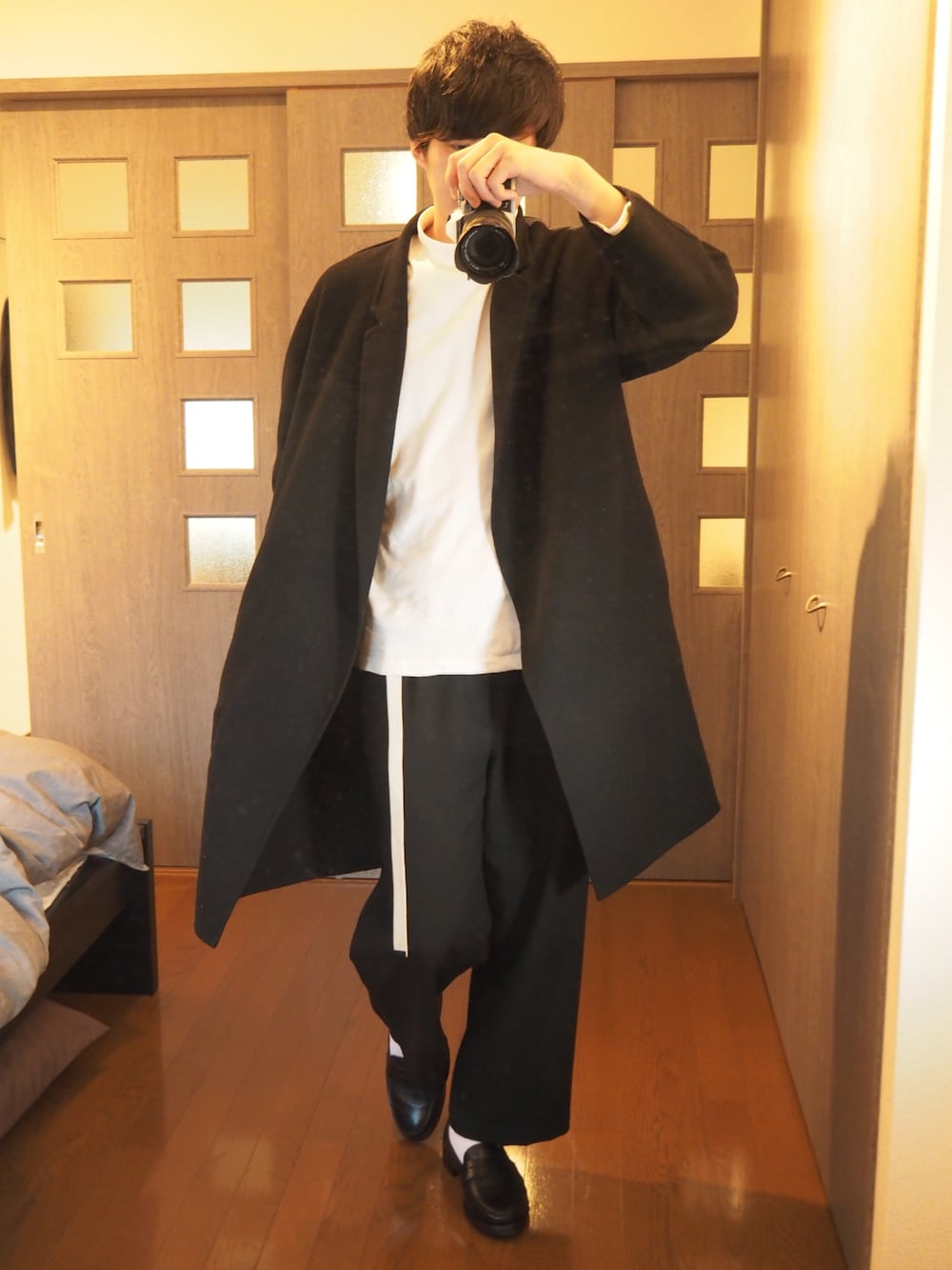 久しぶりの更新✨ オーバーコートにワイドパンツを合わせた超ビッグシルエットコーディネート☺️ シルエットが極太なので、バランスを取るためにドレスライクなローファーを合わせました☺️☺️ 結構お気に入りのコーデです(/・ω・)/