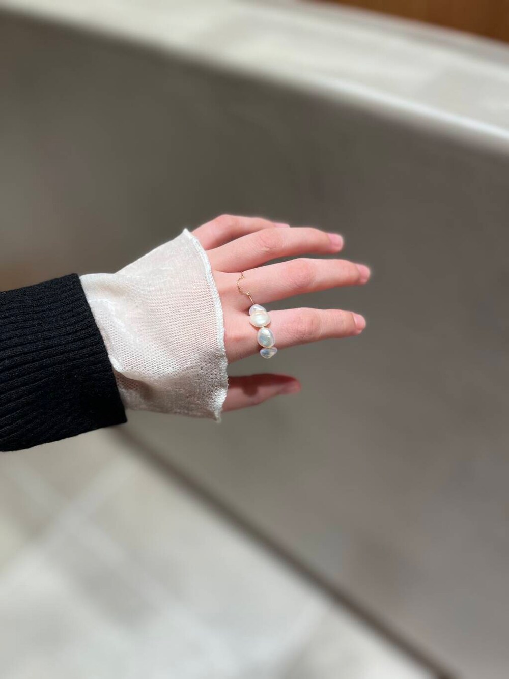 パールリングを主役にして隣は さりげないチェーンとコンビのリングにしました
