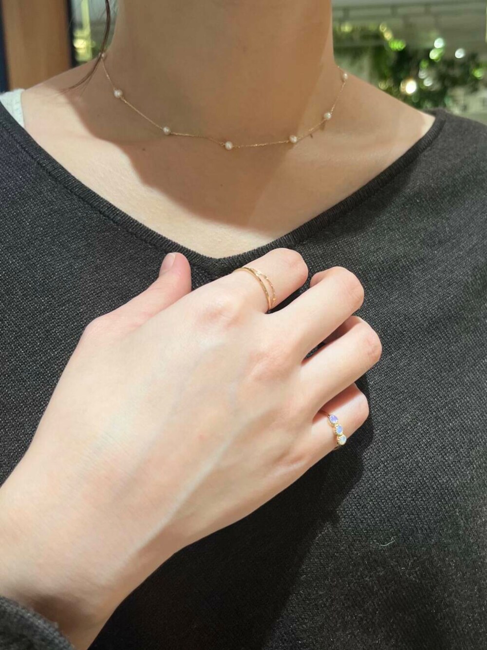 さりげないパールがアクセントになるネックレス アジャスターで短くしてチョーカーのように着用しました