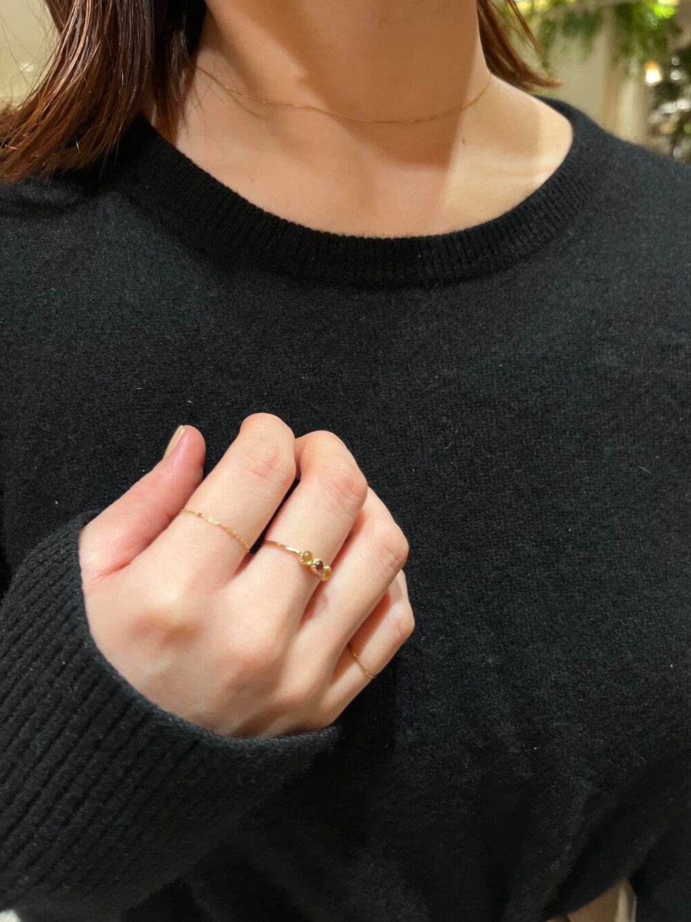 中指に着用しているリングは3石入っています (ガーネット.シトリン、グリーンアメシスト) どの石も馴染みやすいので合わせやすいリングです three stone ring mulch 10K ¥36.300