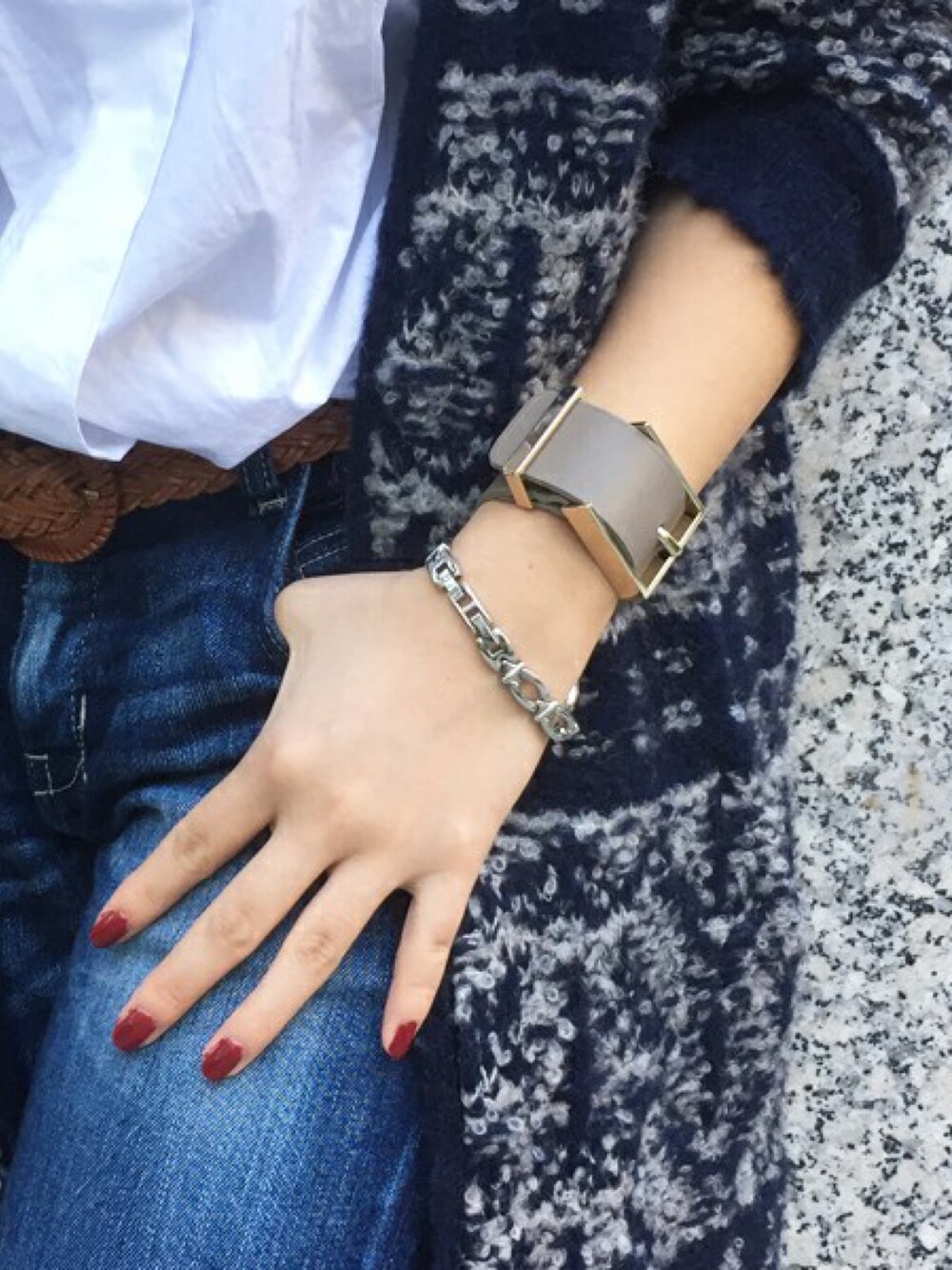 Jines _Officialのブレスレット「MAISON BOINET 【 メゾンボワネ 】 カーフレザー ゴールド スクエアバックル ブレスレット」を使ったコーディネート