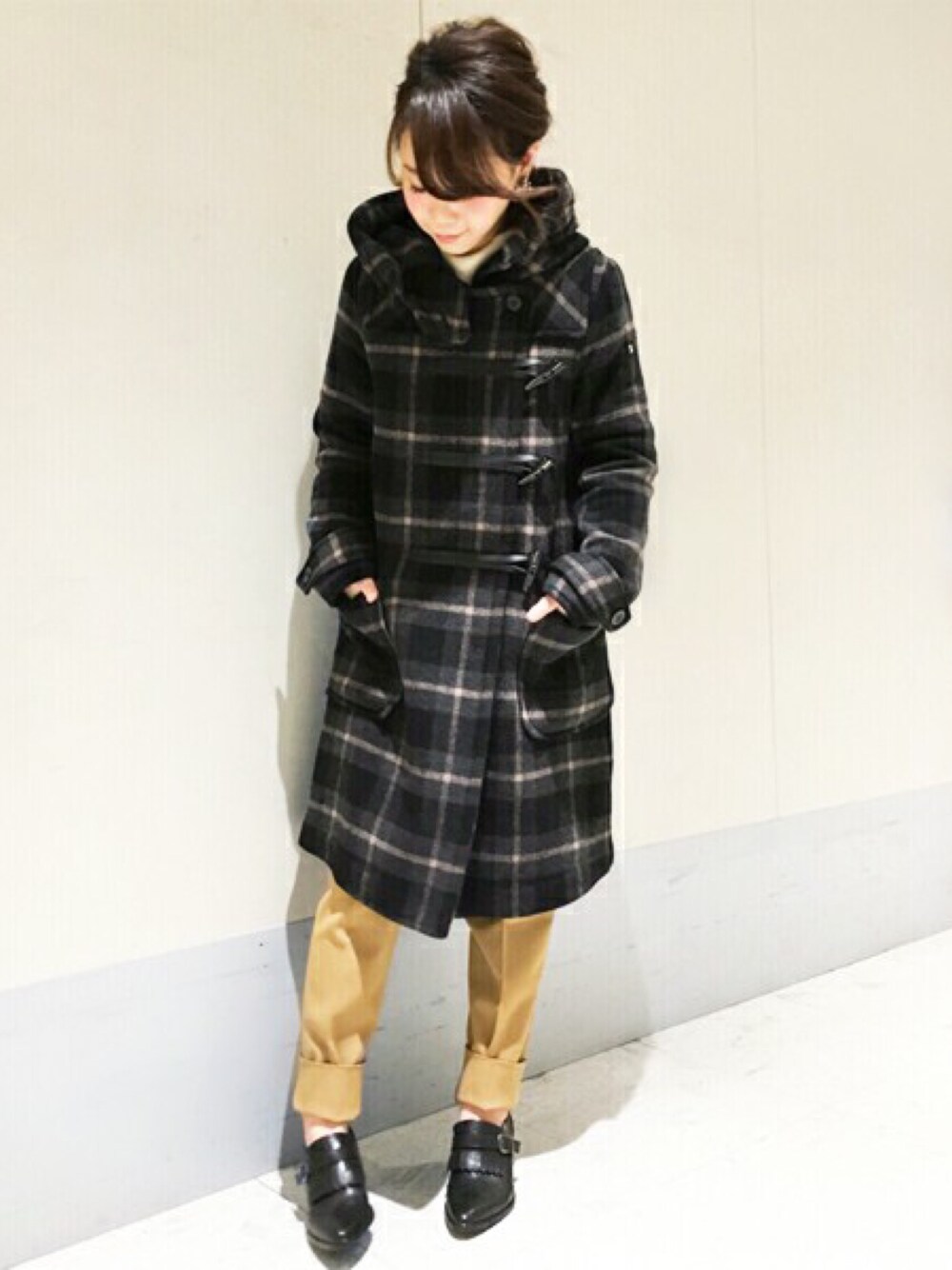 Jines _Officialのダッフルコート「ダブルフェイス チェックダッフルコート」を使ったコーディネート