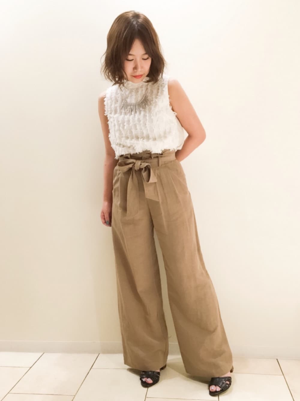 天王寺MIO staff いっきに気温が上がって暑いですね>< そんな時は1枚でお洒落に着れるノースリーブトップスがおすすめ!! バック切り替えで後ろ姿も完璧☆ 麻混のパンツは風通しが良いので、ワイドでも着心地◎ これからの季節にぴったりです! 皆さんも熱中症にはお気をつけください◎