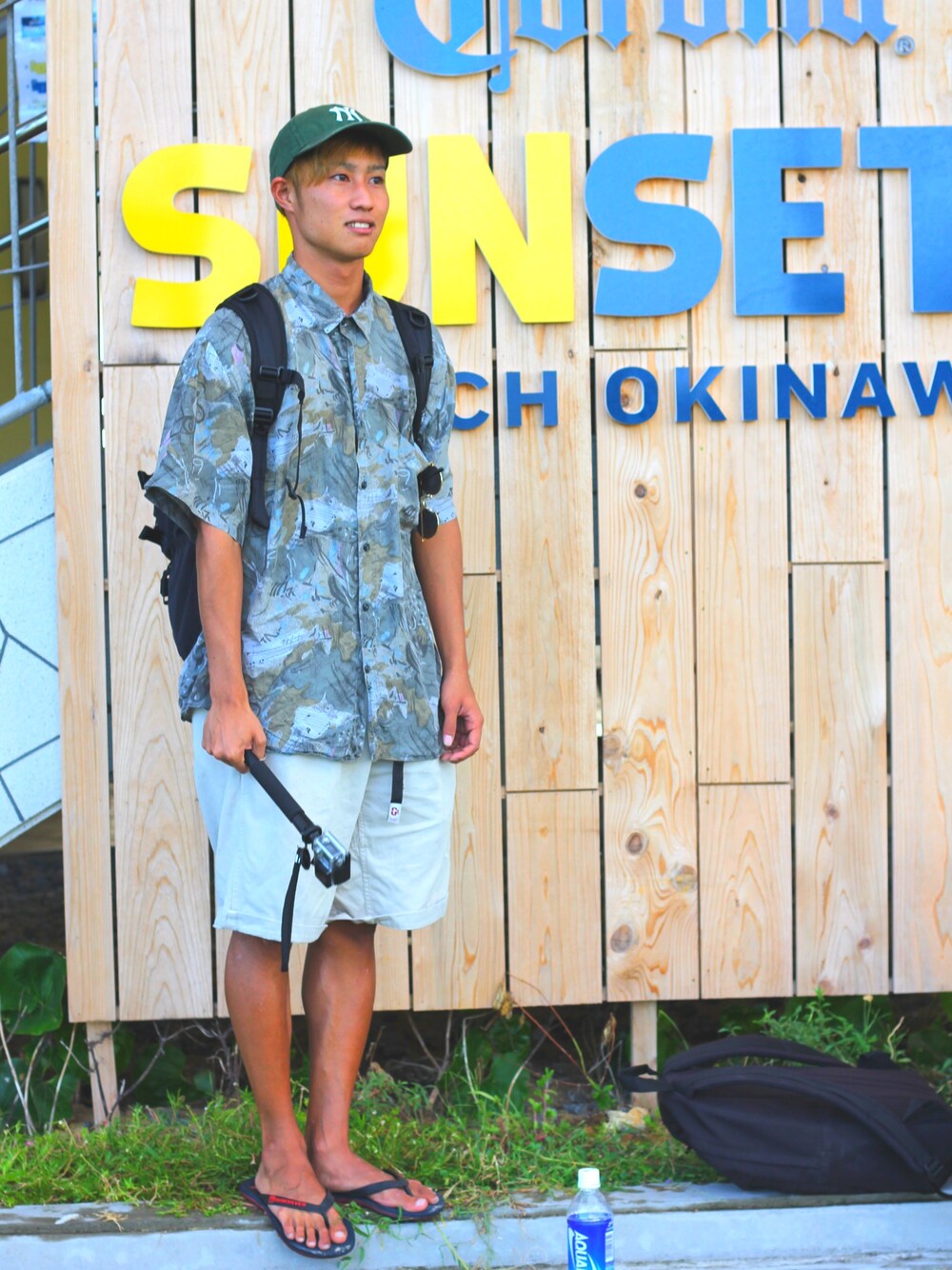 9月に行った沖縄での1枚。 美らサンビーチでのコロナのイベント。 ニューエラのキャップを木下優樹菜さんに憧れて被ってました。 原宿古着で購入したレーヨン素材の柄シャツ。 目立っていいかんじ😊 gopro片手に持って、大きいリュックをパンパンに詰め込むラフなバックパッカー😎