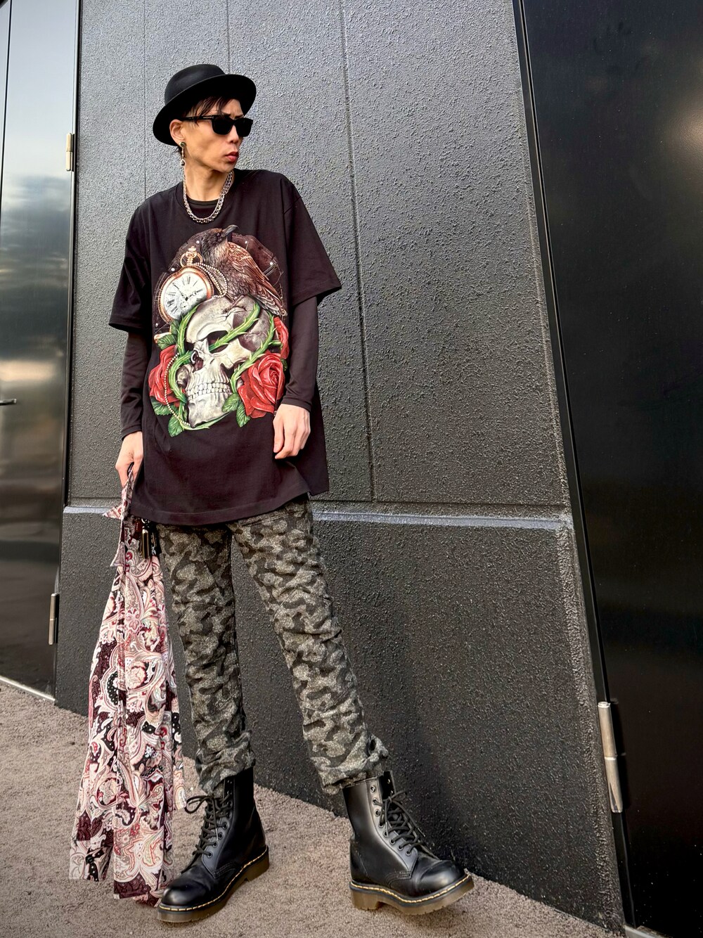 ☆ご覧いただきありがとうございます☆ JINです! オーバーサイズのロックTが存在感ヤバめなコーデです!スカルの鼻にリアルピアスが付いてたり かなりディテール イケてるんで、かっこよさを放ちまくってると思います😁☠️ ドーパミンというのは、リスペクトするお洒落な方に感化されて溢れ出るヤツなんでw またかっこいいコーデを毎日投稿してくので、 よろしくお願いします😊
