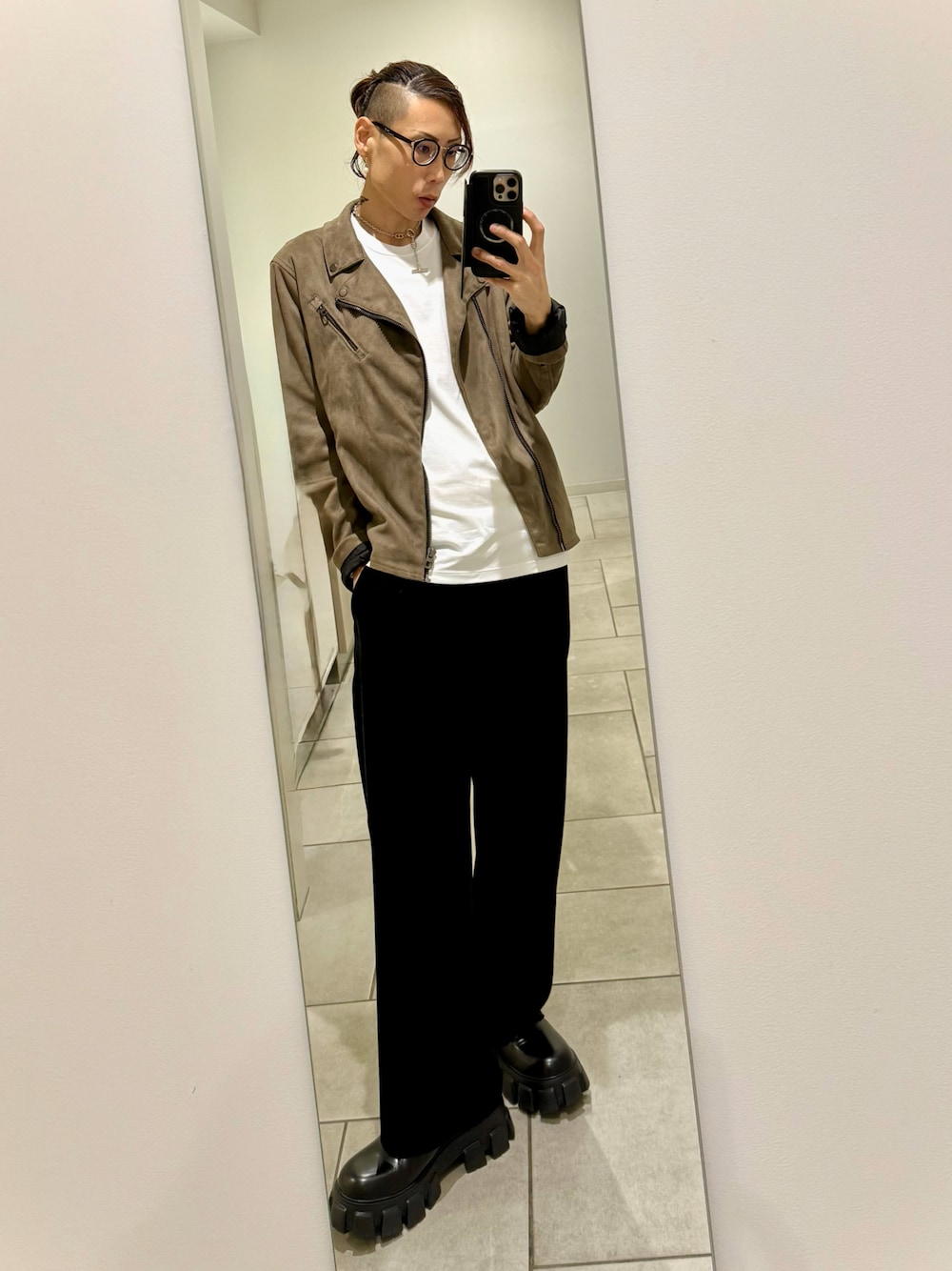 ☆ご覧いただきありがとうございます☆ JINです! 久しぶりの投稿失礼します 全てワンサイズアップのサイジングでのコーデです これからは、このノリのコーデをベースにオシャレを楽しみたいと思います 薄手のスエードライダース ベロア素材のリラックスパンツ 素材とサイジングが今日のコーデのポイントです またぼちぼちアップしていきますので、 よろしくお願いします