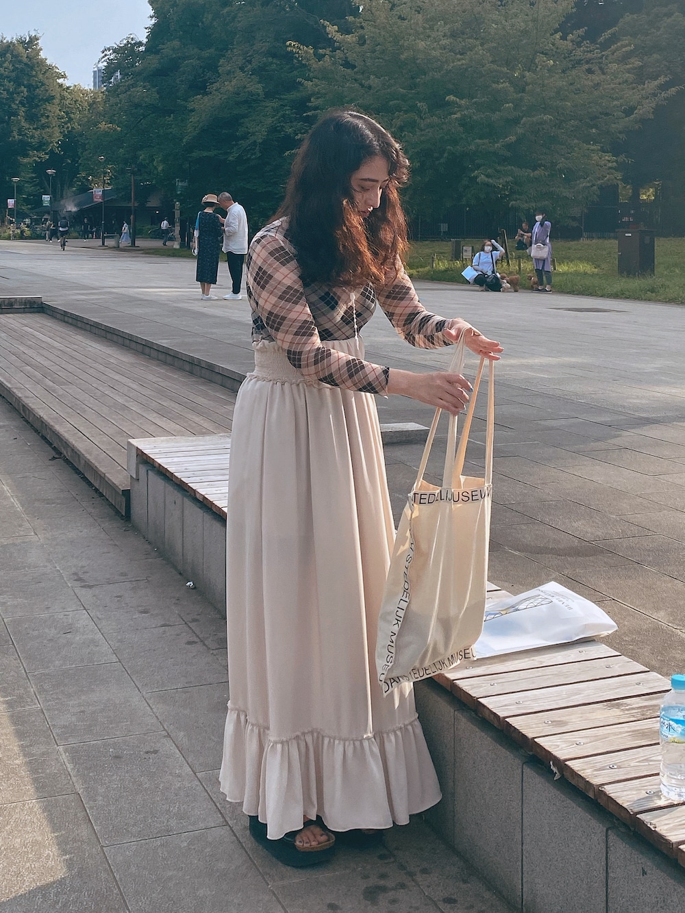 春らしい服の日 ふわふわのロングスカートは春らしいアイテムだと思います。チェック柄のゴルチエのトップスが透けてるのも可愛い。