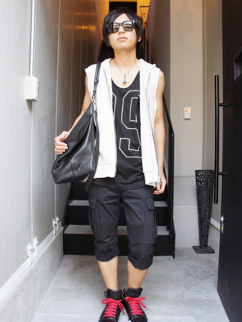 タンクトップ Dope by Stampd ショートパンツ BALMAIN ハイカットスニーカー LANVIN バッグ Atelier Marchal サングラス TOM FORD バルマンの人気定番アイテム、ノースリーブパーカーの今季のデザインはバックスタイルに大きくライオンが刺繍されたインパクトあるモデルです。