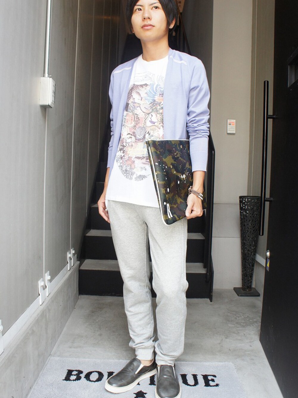 プリントカットソー Just Cavalli スウェットパンツ Acne Studios スリップオン Maison Martin Margiela クラッチバッグ GENTIL BANDIT ワープブレスレット CHAN LUU 淡いトーンでまとめた爽やかなスタイル。スウェットパンツとカーディガンのリラックス感がポイントです。