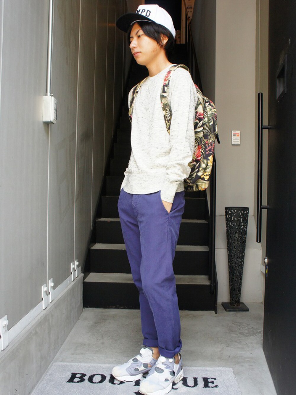 パンツ TODD SNYDER バックパック Ami Alexandre Mattiussi キャップ Dope by Stamped ハイテクスニーカー Reebok ゆるさのあるストリートカジュアルスタイル。ハイテクスニーカーやAMIのバックパックは個性的で人気のアイテム