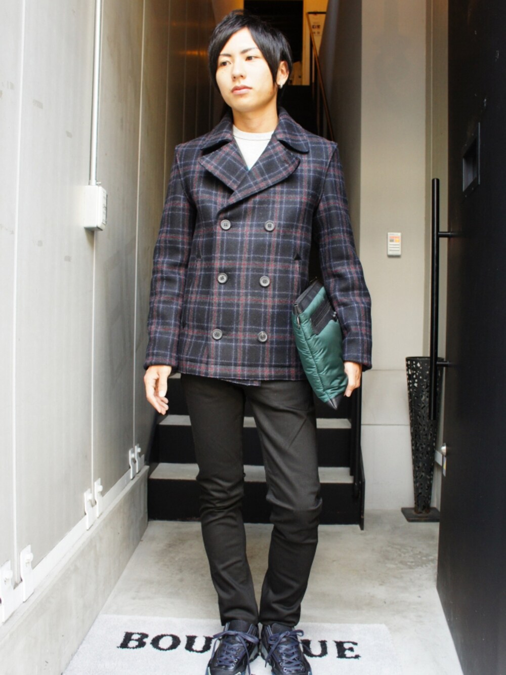 Coat ( Check ) LANVIN College Photo ( Grey ) Acne Studios Max Stay Cash ( Black ) Acne Studios High Tech Sneaker ( Black ) LANVIN Clip L Clutch Bag ( Vert ) BALENCIAGA LANVINのチェック柄Pコートをメインにしたスタイル。