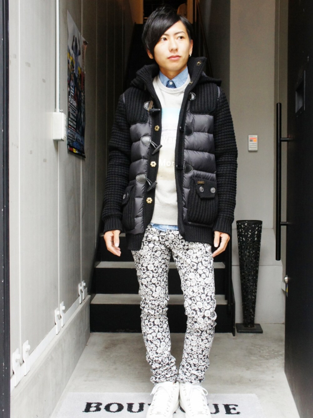 Knit Duffel Coat ( Black ) Bark College Photo ( Grey ) Acne Studios Jeffrrey Den ( Indigo ) Acne Studios Jean Skiny ( Black ) KENZO Arena Sneakers ( White ) BALENCIAGA Bark×KENZOのスタイリング。
