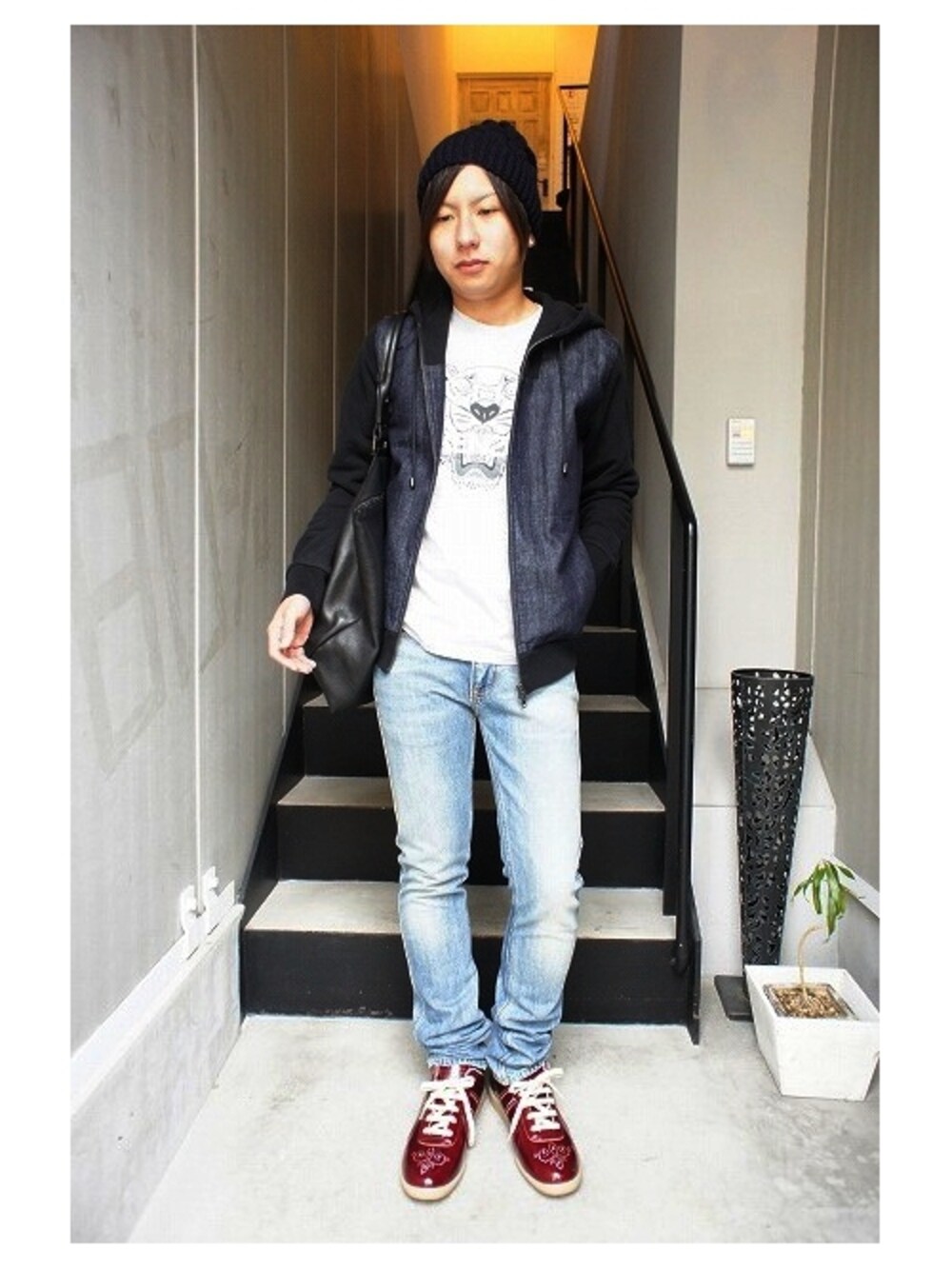 パーカー Martin Margiela Tシャツ KENZO スニーカー Martin Margiela ニット帽 Martin Margiela バッグ Atelier Marchal マルタン・マルジェラのアイテムをメインにしたカジュアルスタイル スペインのアトリエマーシャルのバッグ等、小物を効かせて