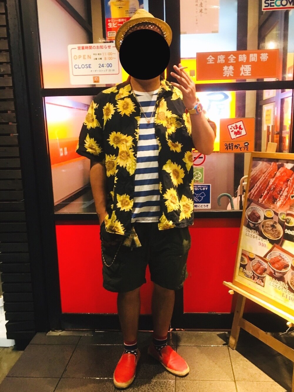 UNIQLOの撥水パンツ以外は全部古着 ヒマワリアロハがお気に入り ボーダーにアロハは意外といい組み合わせ 帽子 古着 250円 Tシャツ 古着 200円 アロハシャツ 古着 2900円 ハーパン 新品 2000円 靴 古着 1500円