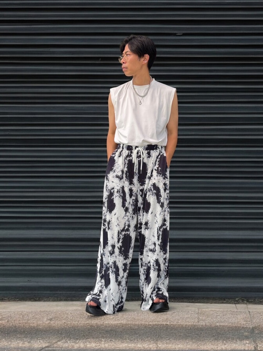 日中の暑さがキツく暑い🫠ノースリーブ解禁で👍Lui'sのノースリも色違いであるんですが💦特に白は重宝します💎 Nilwayの袴パンツはプリーツで柄も印象的なので他をシンプルに、ただ厚底は必須‼️低身長なんでね😭