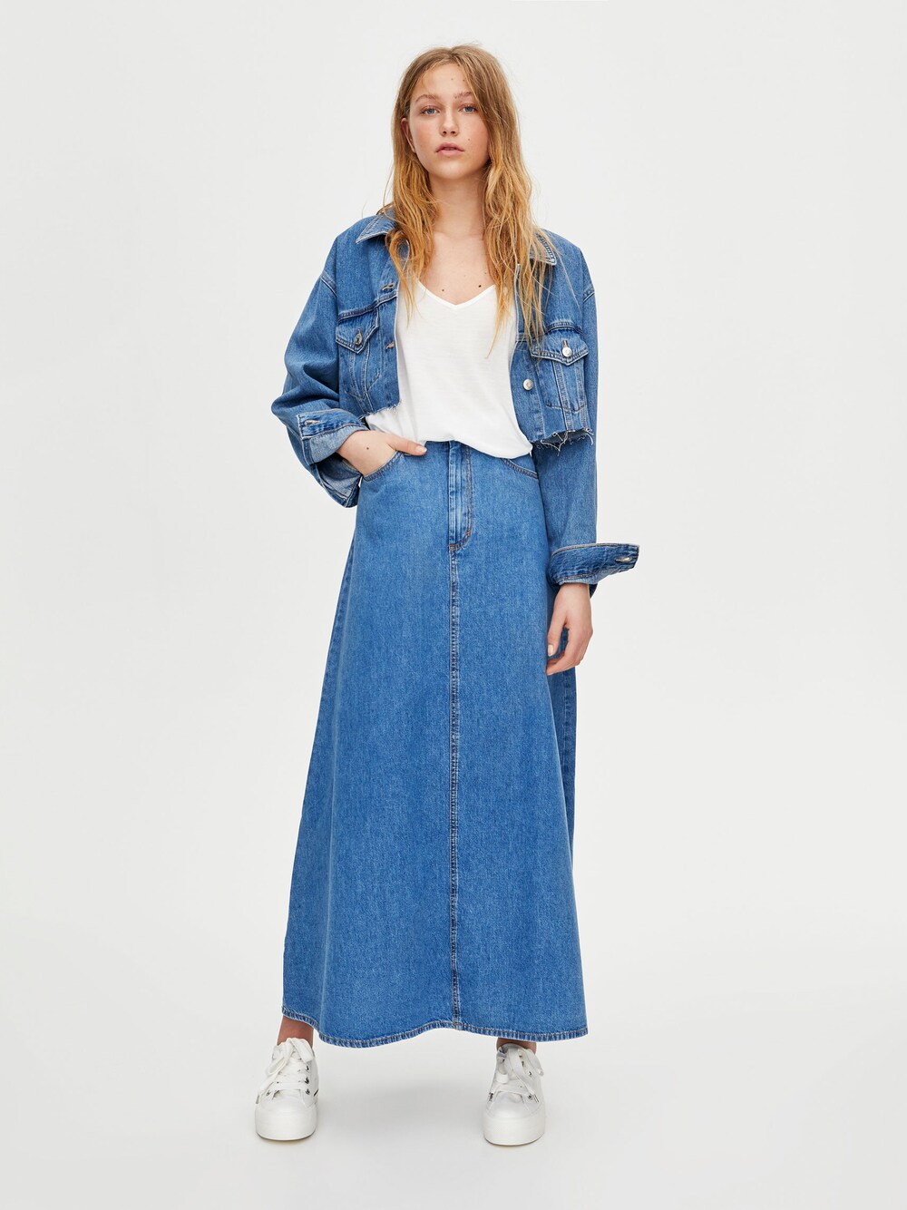 jjdwsonlyのデニムスカート「PULL&BEAR春レデイース復古デニムスカートロング丈」を使ったコーディネート