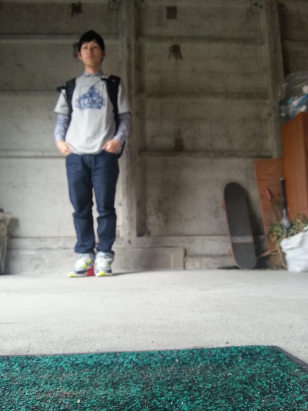グレー系のTシャツ/カットソーを着用したメンズの冬コーディネートの1枚目の写真