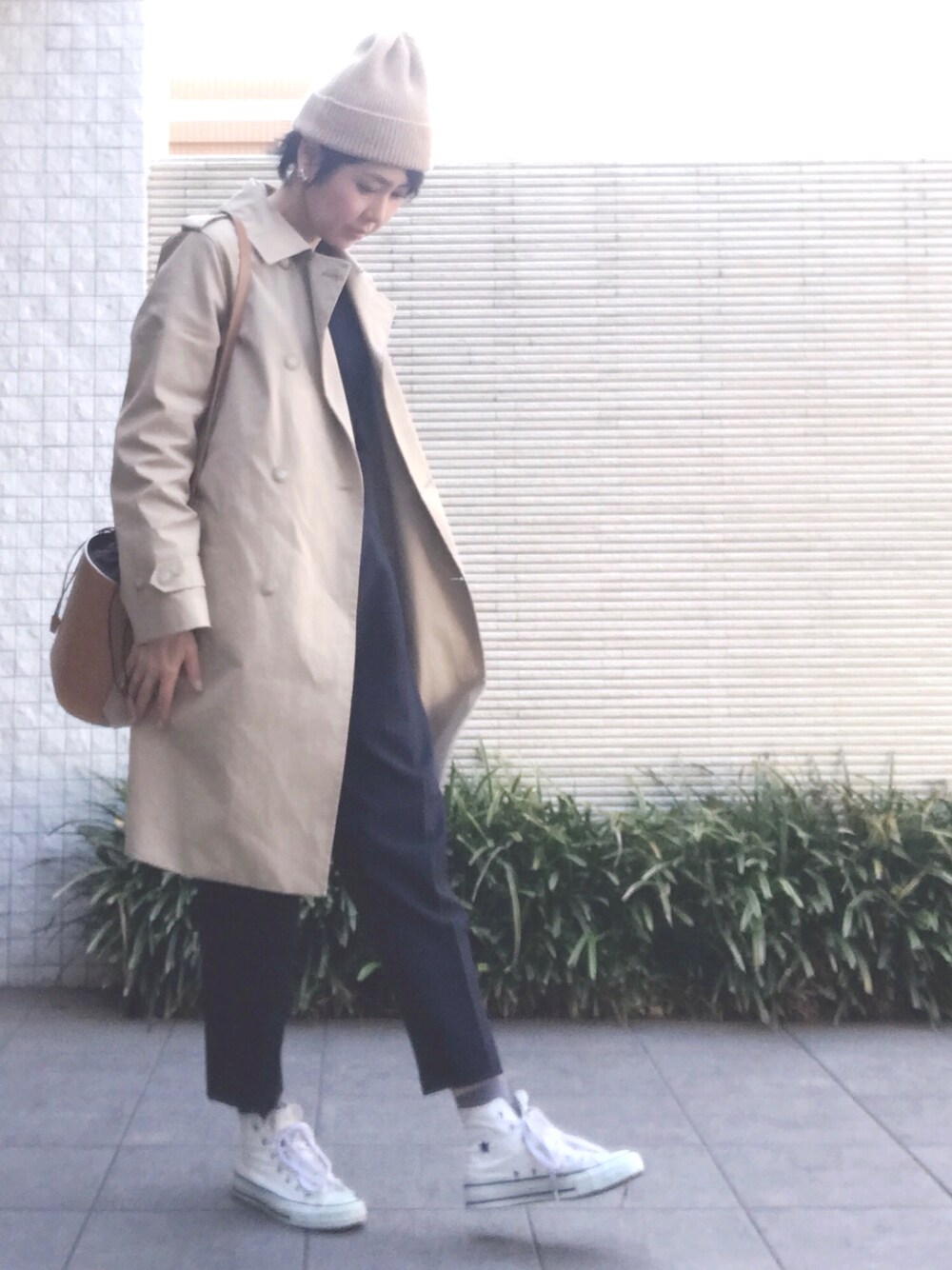 トレンチ×ブラック。 小物はベージュで。 トレンチコートをニット帽とconverse でカジュアルダウン。