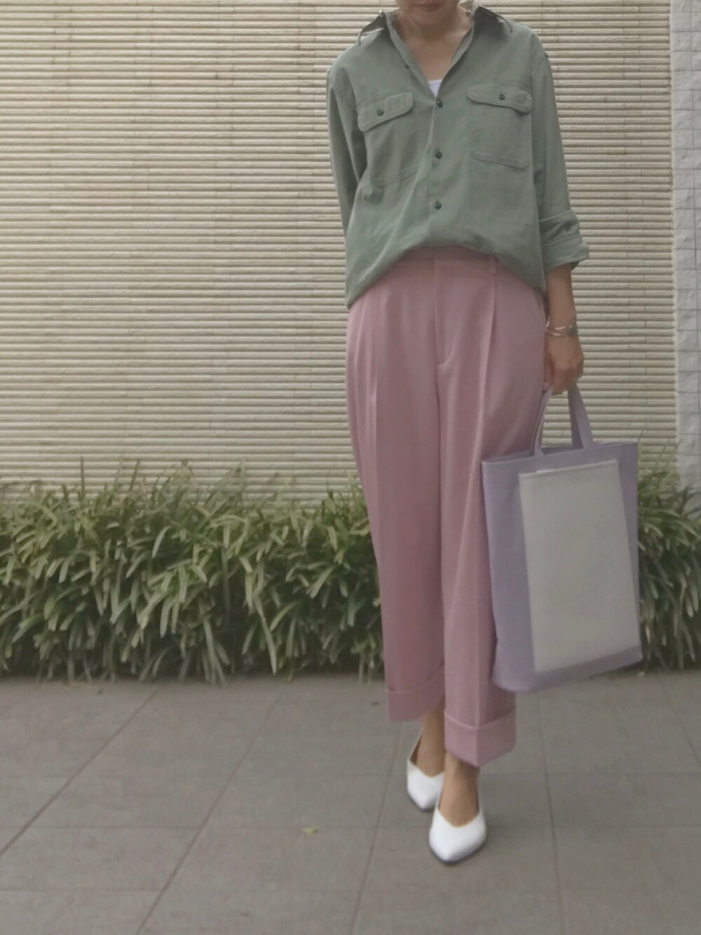 カーキ×ピンク。 カラー×カラーにしたくて、バッグはラベンダーに。 所々に白を入れて、抜けを。