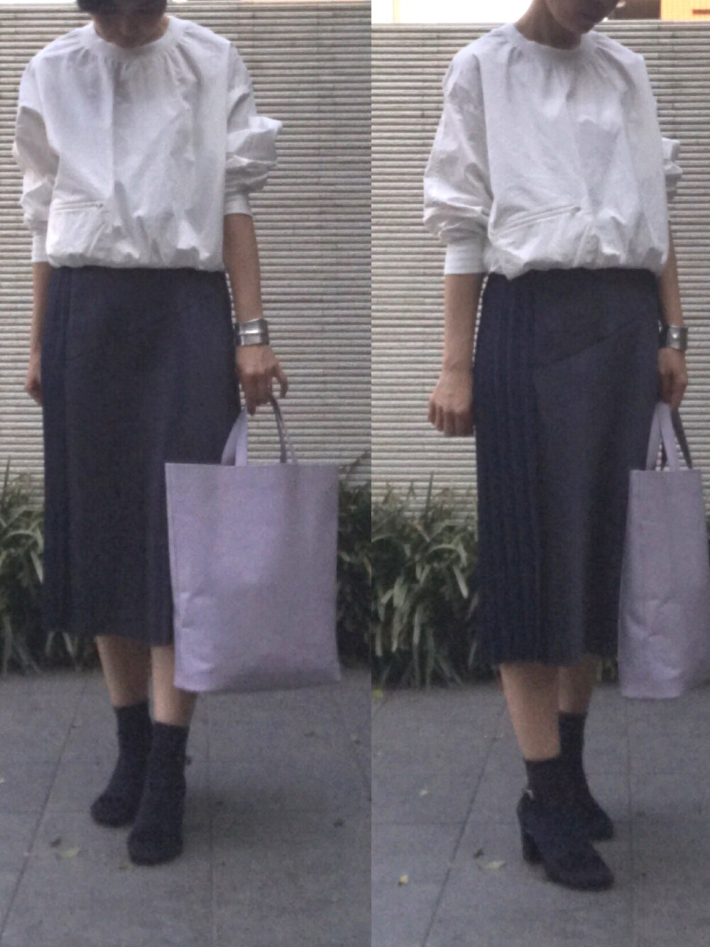 ホワイト×ネイビー。 差し色に、ラベンダー。 スカートは、片側がプリーツになった変形デザインです。