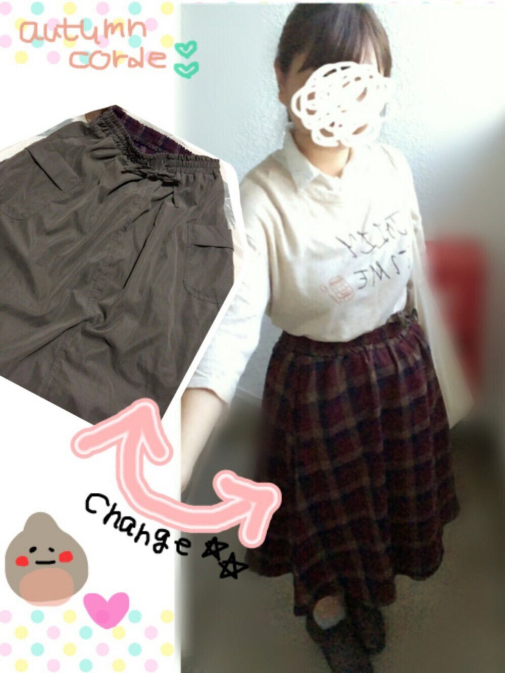 しまむら×merのスカートが可愛すぎて早く履きたくて、すっごく暑いのに秋コーデ🍁🍂 中はカーキで、リバーシブルになるので着回し◎です💓