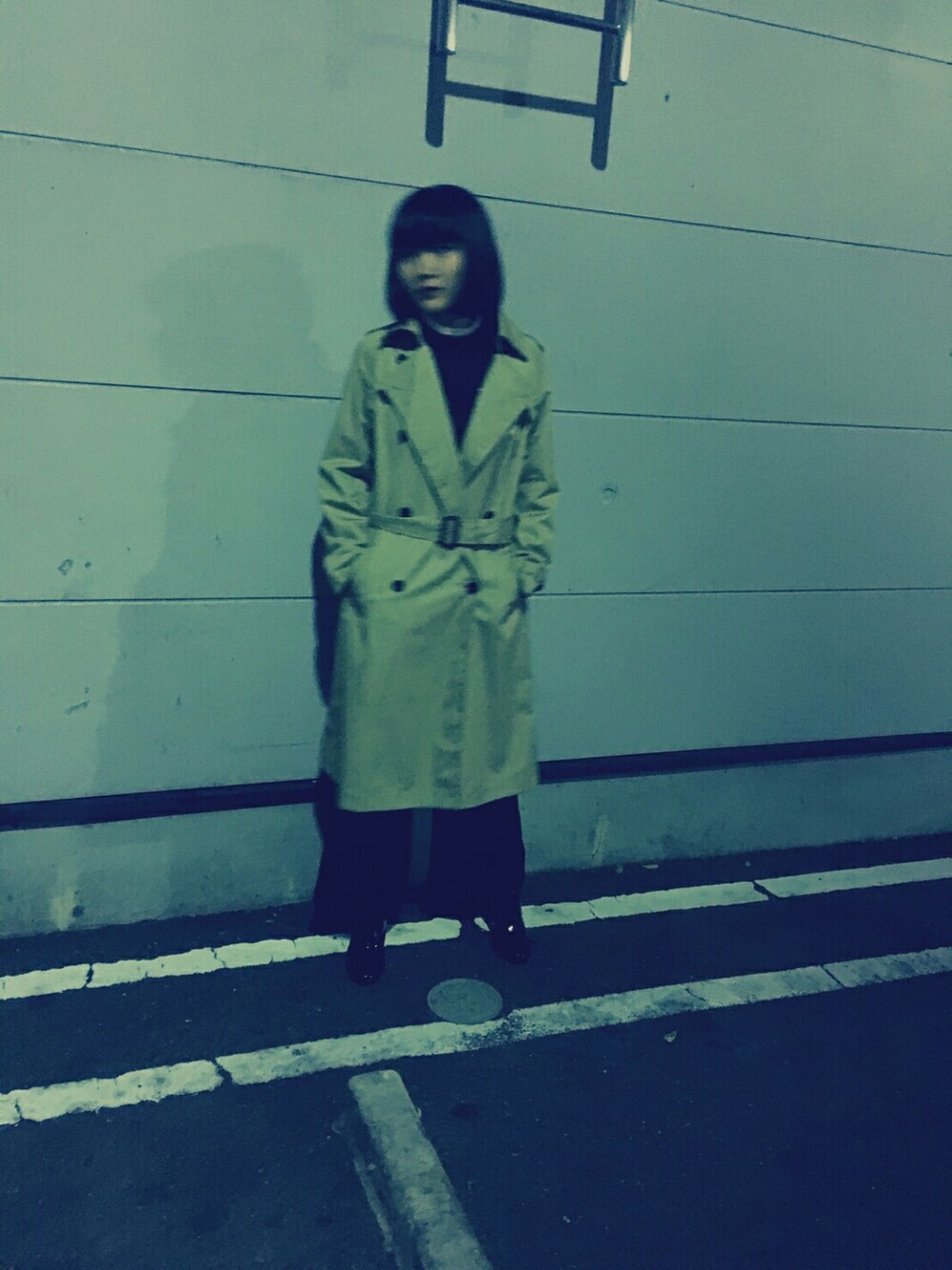 暗くて良く見えませんが、黒いトップスの下に白のハイネックのヒートテックを着ています。 それだけでスポーティ感がでて、トレンチコートの上品さとのギャップが可愛いです😌💞💭