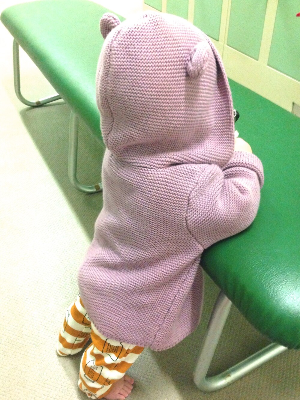 今日は月2回のベビースイミングだったので、帰り道寒くないように一目惚れした耳付きニットパーカーを着ました。 このパーカー、なんととってもオシャレなくるみちゃんとお揃いでした( *´艸`) くるみちゃんほどかわいく着こなせないけど、かわいく見えるよ♡笑 肝心のスイミングは、寒くなったのか暴れ出したので、たった25分で脱落しました…。