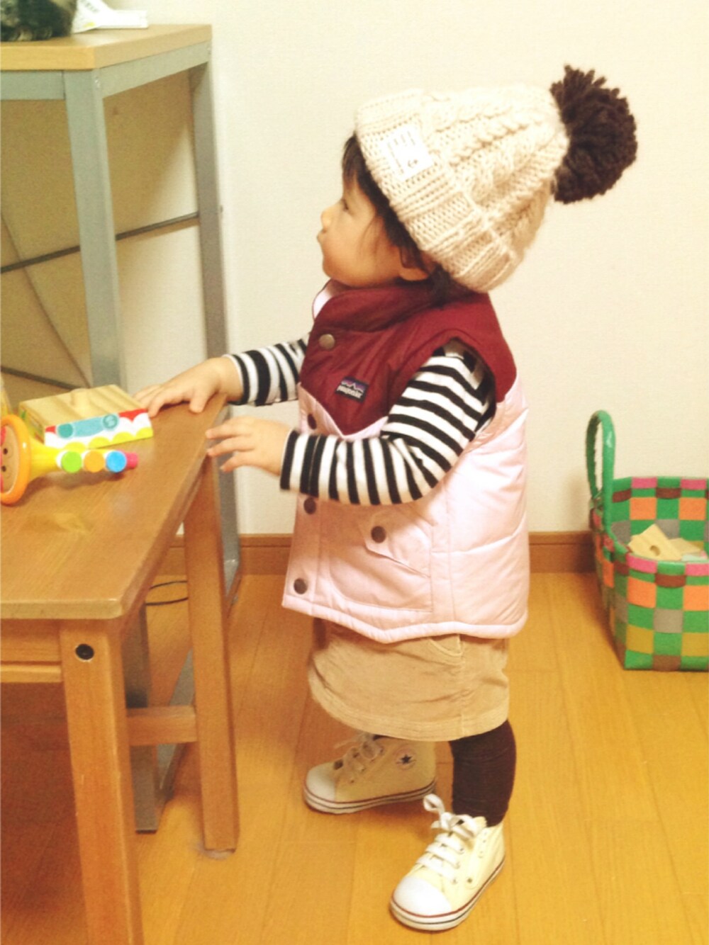 今日はとうとう雪が積もりました。 とは言え、もう溶け始めましたが。 山ウェア好きのオットとハイテンションで買ったパタゴニアのダウン、女の子らしく着せようとしたら地味コーデになっちゃったけど大丈夫でしょうか…? レギンス、ボーダーだけど全然わからない。。。 カモフラ柄のボアスカート(実はネックウォーマー)も合わせたけど、似合わない上に着ぶくれしたのでやめました。 さっき、ふゆさんが貴重な一歩を踏み出しました。 はじめの一歩はばぁばに向けて。 私が見てないところで…しくしくしくしく。 あ、明日は私の誕生日だから、私に向けての一歩は明日にとってあるんだ、きっと!