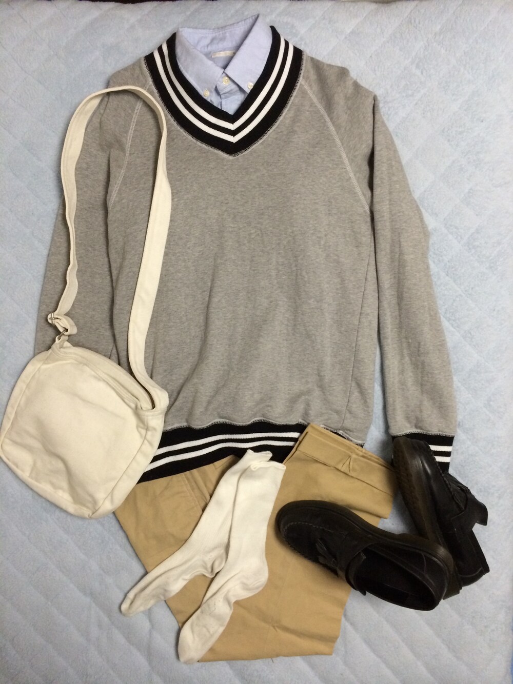 グレー系のスウェットを着用したメンズの秋コーディネートの1枚目の写真