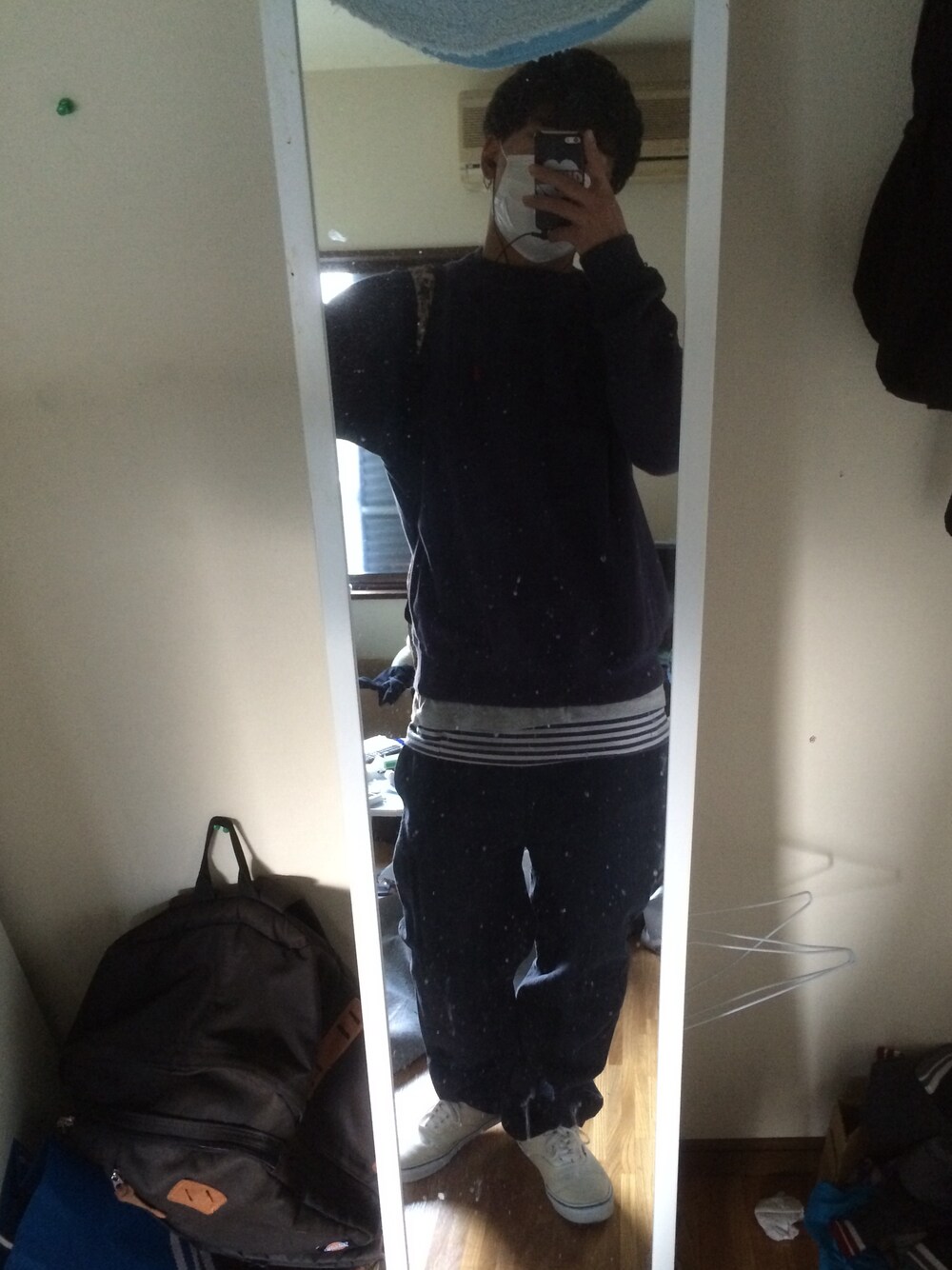 イージーパンツを使ったストリート? イージーパンツの素材感に惚れた。 古着ラルフローレン スウェット ヘインズ グレーTシャツ 古着 BILLA BONG 3色バイカラータンクトップ イージーパンツ ブランド名不明 VANS ホワイトスリッポン NIKEの迷彩柄のバック