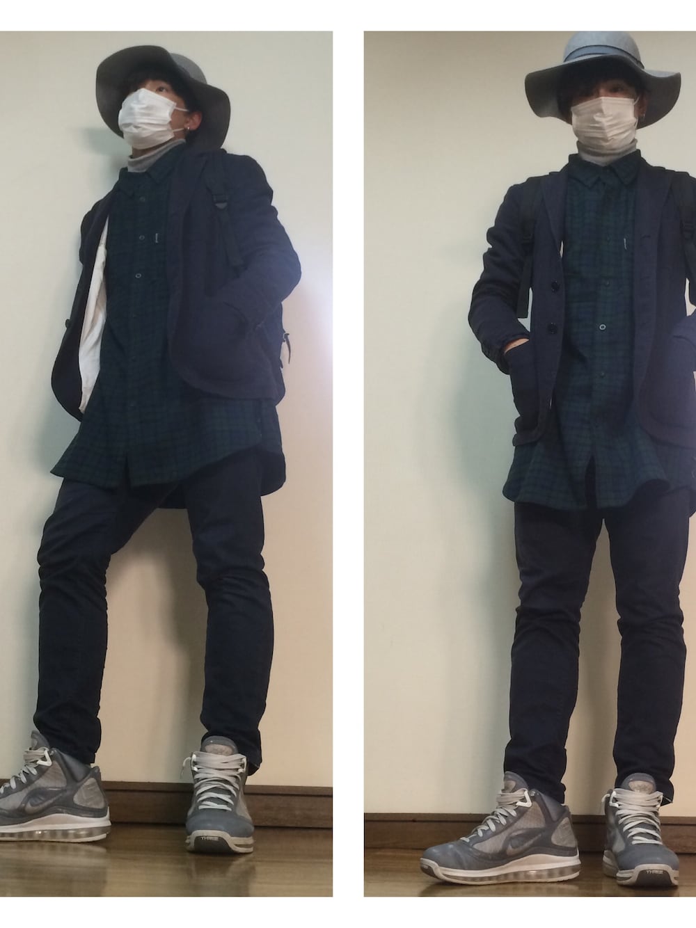 グレーのタートルネックにロングシャツ、ネイビージャケットに、ネイビースキニー