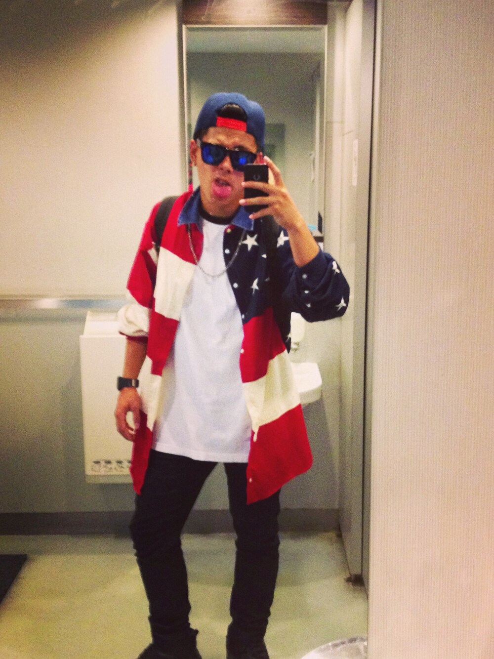中々面白いと思うんですが笑 友達にもらった帽子 390マートのサングラス 古着の国旗柄シャツ 中のシャツも古着のアディダスのシャツ 下のスキニーはUNIQLO 靴はナイキ