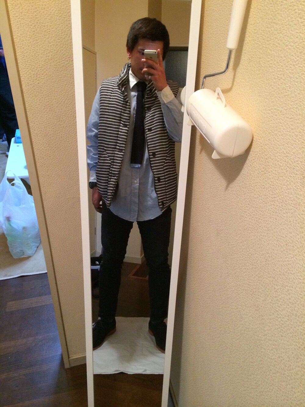 古着のシャツ ボーダーのダウンベスト UNIQLOのネクタイ UNIQLOスキニー CEDAR CRESTの靴