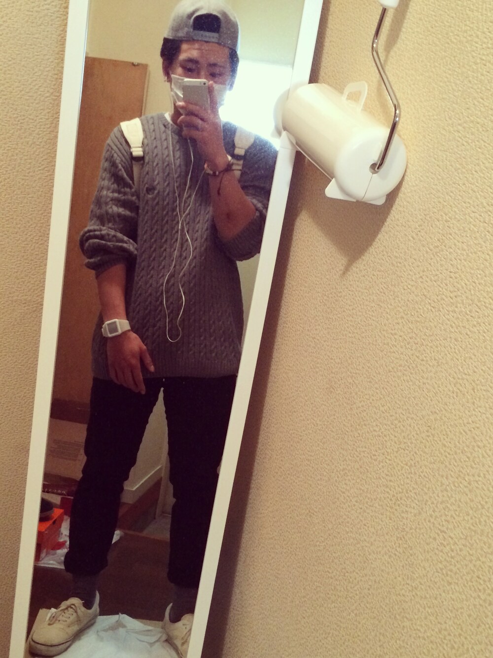 よくわからないコーデ ニット×キャップで系統がわからなくなった笑 CHAPSのニット used UNIQLO スキニー WEGO キャップ 無印の白バック SEVENS 時計