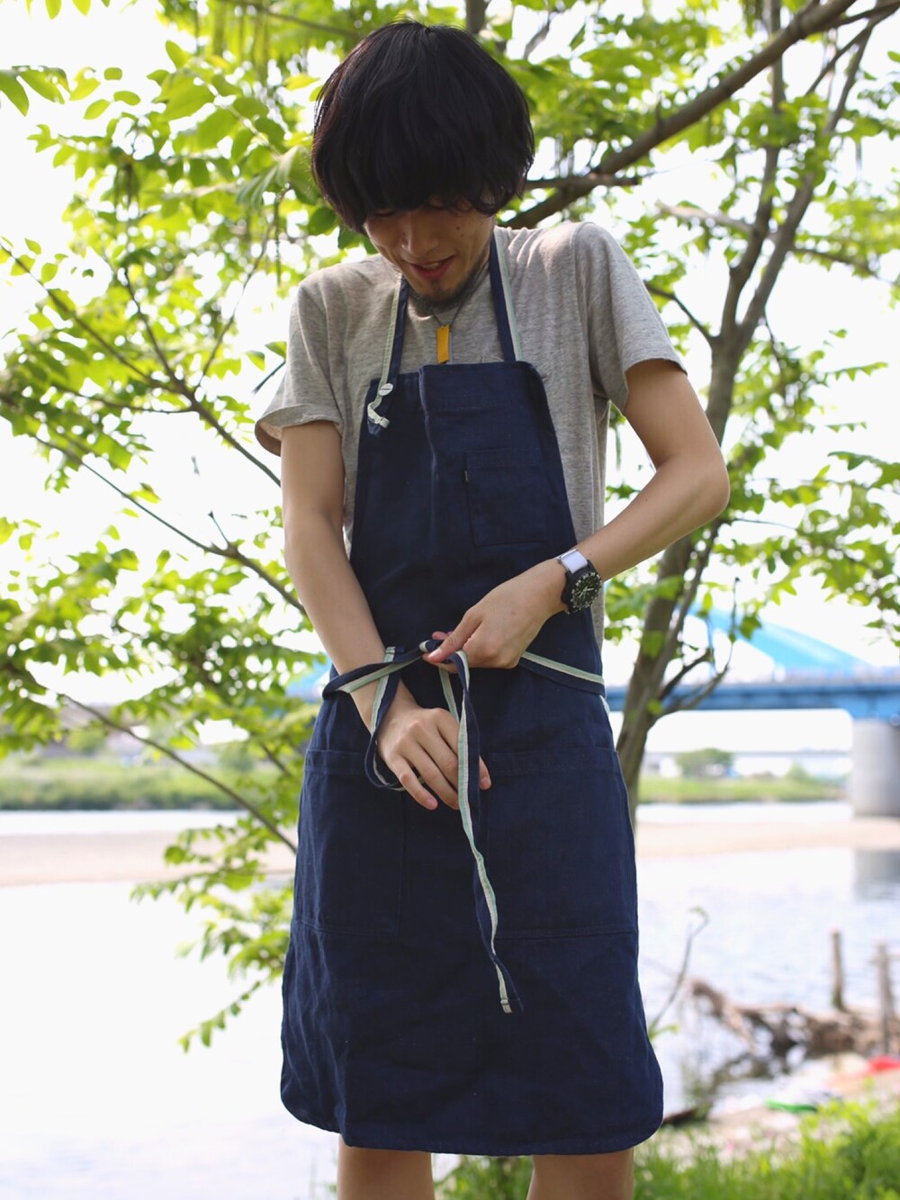 ブルー系のエプロンを着用したメンズの春コーディネートの1枚目の写真