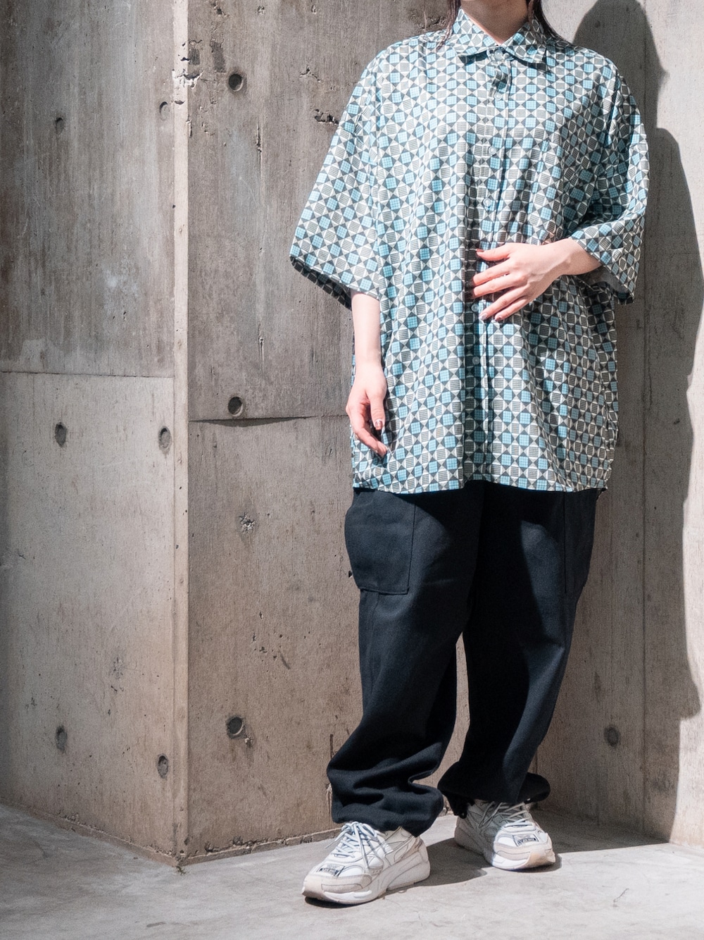 Tomomi/低身長コーデのシャツ/ブラウス「【i】ポリピーチ 総柄プリントビッグシャツ」を使ったコーディネート