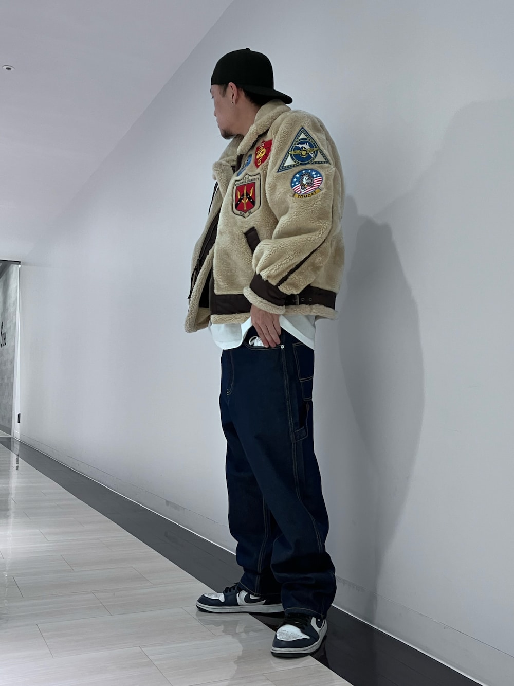 JOTAROのブルゾン「【AVIREX/アビレックス】BOA B-3 TOP GUN / ランダムワッペン ボアフライトジャケット/ボアブルゾン/ビッグシルエット」を使ったコーディネート