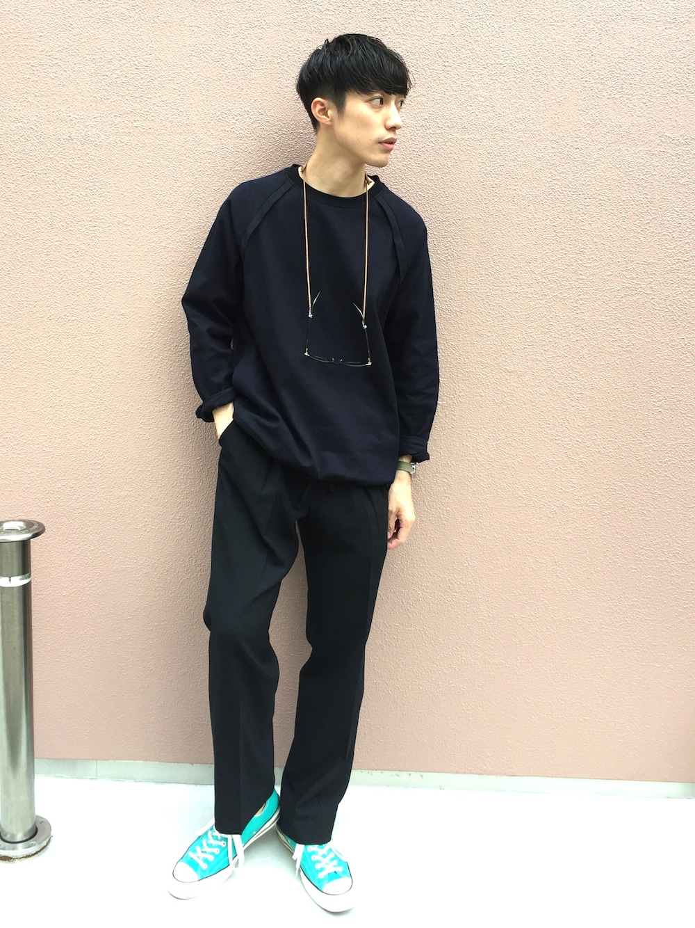 オールブラックのシンプルなコーデ。 トップスは今期のNハリのカットソーにスリーで買った古着のパンツに足元はターコイズブルーで差し色を🌿🌿🌿 fashionを楽しめるいい季節になって来ましたね🍁🍁