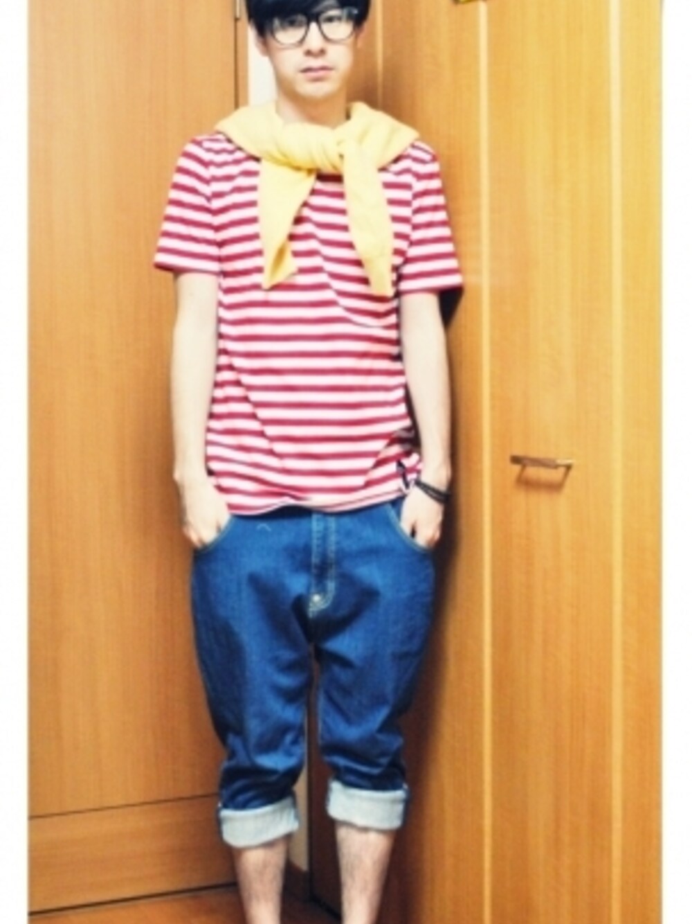 トンボコーデ トンボコーデ! ケントン(kento21)、かちょん、へずっち(hz)、が 魔女の宅急便のトンボコーデやってたから僕もやった! 意外と簡単にトンボになれるのは嬉しい気がする! アイテム的にも安易な感じなので、 いつかこのトンボコーデばっかりでオフ会したいw とりあえずアイテム紹介。 ■メガネ■ 豊天商店のメガネ?よくわからないが、 昔もらった!活躍してます! ■カーディガン■ ユナイテッドアローズの黄色いやつ。 生地は結構もこもこで重量感あって堅いから、 羽織るのに向いてないw ■Tシャツ■ にゃーのボーダーT(画像2) 三田のアウトレットで2000円位だった。 セカストでにゃーT3000円位で売ってた。 アウトレットやるじゃん!って思った。 ■ズボン■ ネネットのラクダデニム これはお気に入りのズボン! 後ろがすごく可愛い!(画像3) シンチバック?と可愛いラクダさん素敵! シルエットも好き!で、去年?かな? アウトレットで3500円位で投売り?されてたから、 メンズとレディースサイズ両方買った! そしたらメンズサイズの方にバッテリー液がかかって、 デニムの生地が腐敗した様な状態で穴が。。。 なので、穿いてるのはレディースサイズ。 ----以上です---- そしてお知らせ! 5月5日、お暇な人は箕面市へ遊びにきてくださいー! 阪急箕面駅前で「みのお瀧道四季のまつり春」という お祭りをやってます! その中でもメインの企画にあたるイベント、 「青い鳥をさがせ!」では、新緑が美しい瀧道と、 地元商店街に隠れた「青い鳥」を探がすと、 ちょっぴり嬉しいプレゼントがもらえます! 僕は5月5日の当日、朝10時~16時まで、 阪急箕面駅前野外ステージという場所で、 「駅前オンステージ」というイベントの、 MCをやってるのでイジリに来てください! 詳しくは↓のHPをチェック! http://machi.minoh.net/shiki_event/shikimatsuri.htm 5月5日は箕面市へきて瀧ノ道ゆずると僕と握手! ゆずる体操も見てね☆ミ(見所は3:22分) http://www.youtube.com/watch?v=4lC8Pg43Krk 全然再生増えないwww てか、ゆずる調子良いなぁ、ポンデライオンとか、 ローラ、香里奈&西田敏行、きゃりーぱみゅぱみゅ、 セカオワと競演って…ゆずる体操のお兄さんにも注目を!! (他力本願ですまん)