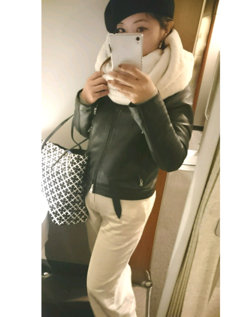 移動と荷物重視! 大きな柄バッグに合わせたラクチンコーデ。 実家に帰るだけで 誰にも会わないとついつい手をぬいてまう!