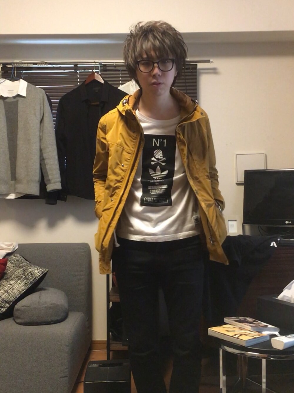 渋めのイエローをポイントにしたコーディネートです
