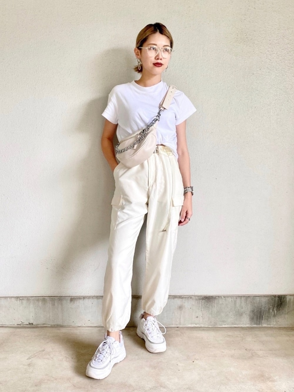 🤍#ホワイトコーデ 🤍 全身真っ白!小物はクリアでまとめました🧊 トップスはインしてしまうとメンズっぽくなりすぎるので くるっとねじって上に入れ込んで チラッとお腹が見えるように |ω・)チラッ 顔周りにインパクトのあるアイテムが多いので メイクは眉毛と濃いめリップのみで調節💄