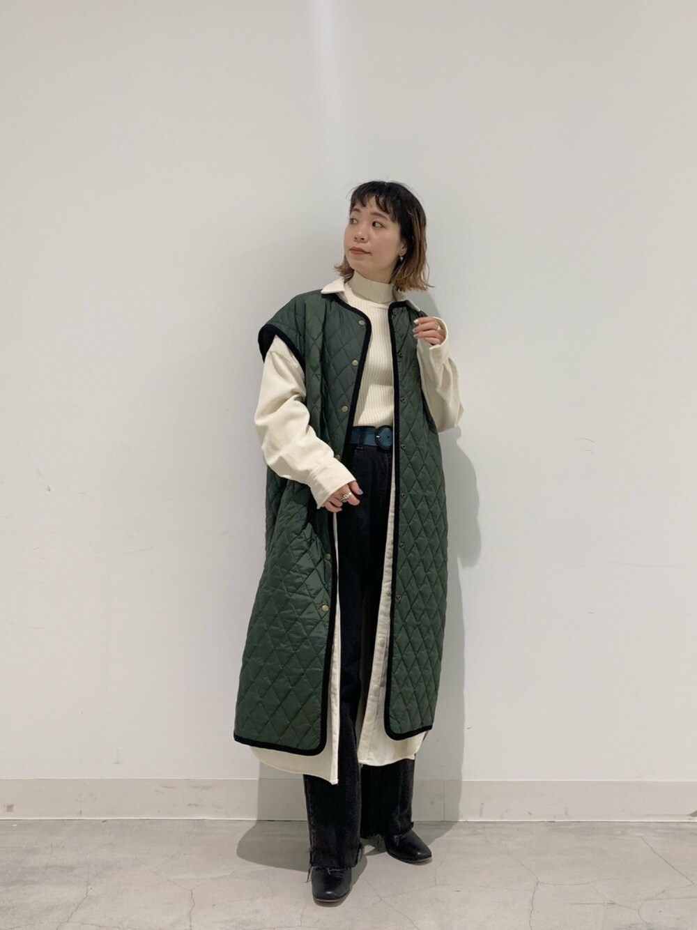 ロングのシャツワンピにロングベストの合わせが可愛い。 ハイウエストデニムにスッキリなリブニットをタックインすることで、小柄さんでもバランスの良いタイリング。 着用アイテム *キルティングベスト ・サイズ感: 全体的にゆとりがあります。ベルトで絞ってスッキリ見せても◎袖口のも広く、ボリューム袖のインナーにも羽織れます。 ・着心地: ロング丈ですが、厚すぎない素材で軽くジャケットの上にもプラスしやすい。 *コーデュロイバックタックシャツワンピース ・サイズ感: ゆったりで、厚みのあるインナーも合わせられます。でも着丈は長すぎないので小柄さんにもおすすめ。 ・着心地: 柔らかいコーデュロイ素材で、ゆとりもあるので楽な着心地。 *ハイネックリブニットプルオーバー ・サイズ感: ぴったりと着れるサイズ感が女性らしく◎ ・着心地: しっかり厚みがあり、チクチク感のない素材で着心地良し。